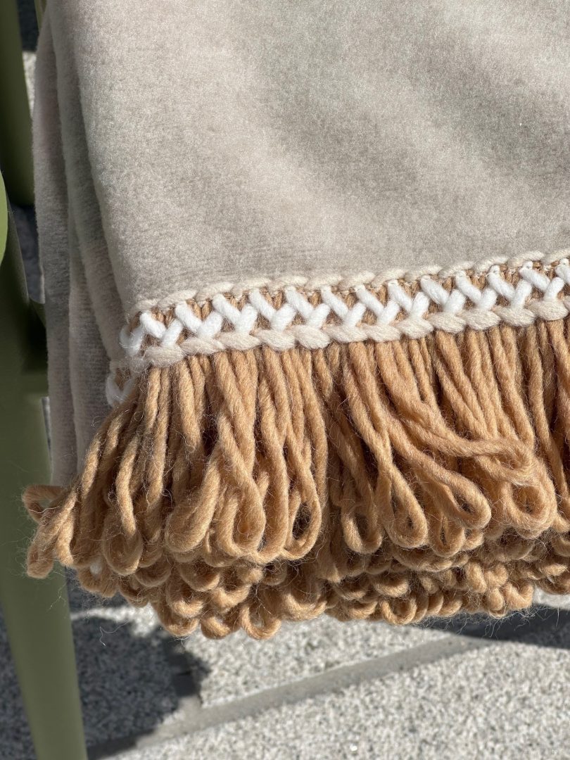 Fargen er hasselnøtt med mørke beige frynser og hvit dekorstripe.