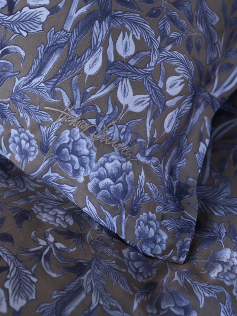 Hazendal sengetøy fra Halvor Bakke er en hyllest til tidløs eleganse. Med sitt delikate blomsterdesign i lyse gråtoner mot en himmelblå bakgrunn, skaper det en harmonisk og sofistikert atmosfære på soverommet.