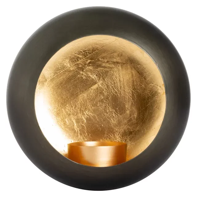 Den vegghengte runde lysholderen i matt svart metall med gullfarget innside gir et vakkert og varmt lys.