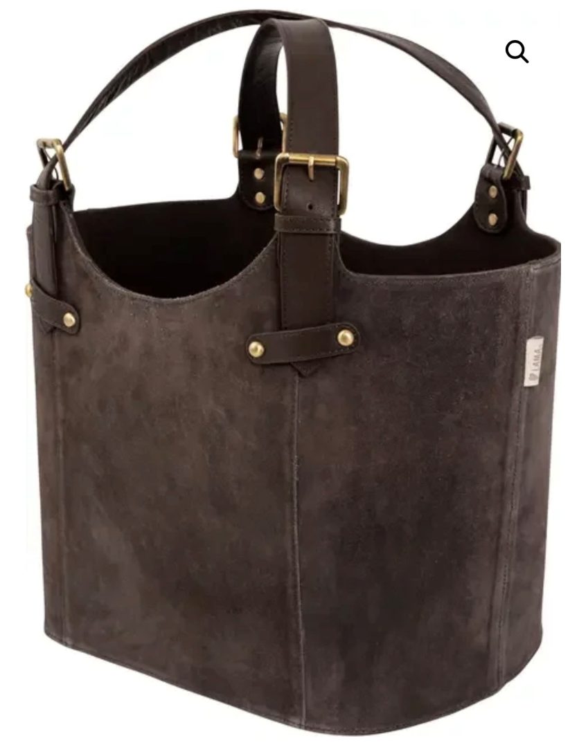 Vedkurv i brunt, semsket skinn. Kurven passer også godt til oppbevaring av for eksempel pledd, leker eller magasiner.