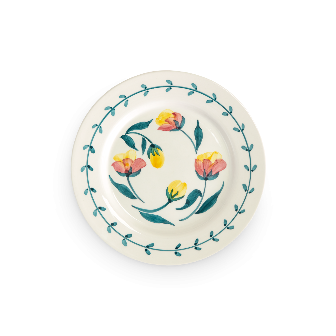 Denne tallerken, utsmykket med et vakkert håndmalt tulipandesign, er en perfekt detalj til bordet ditt.