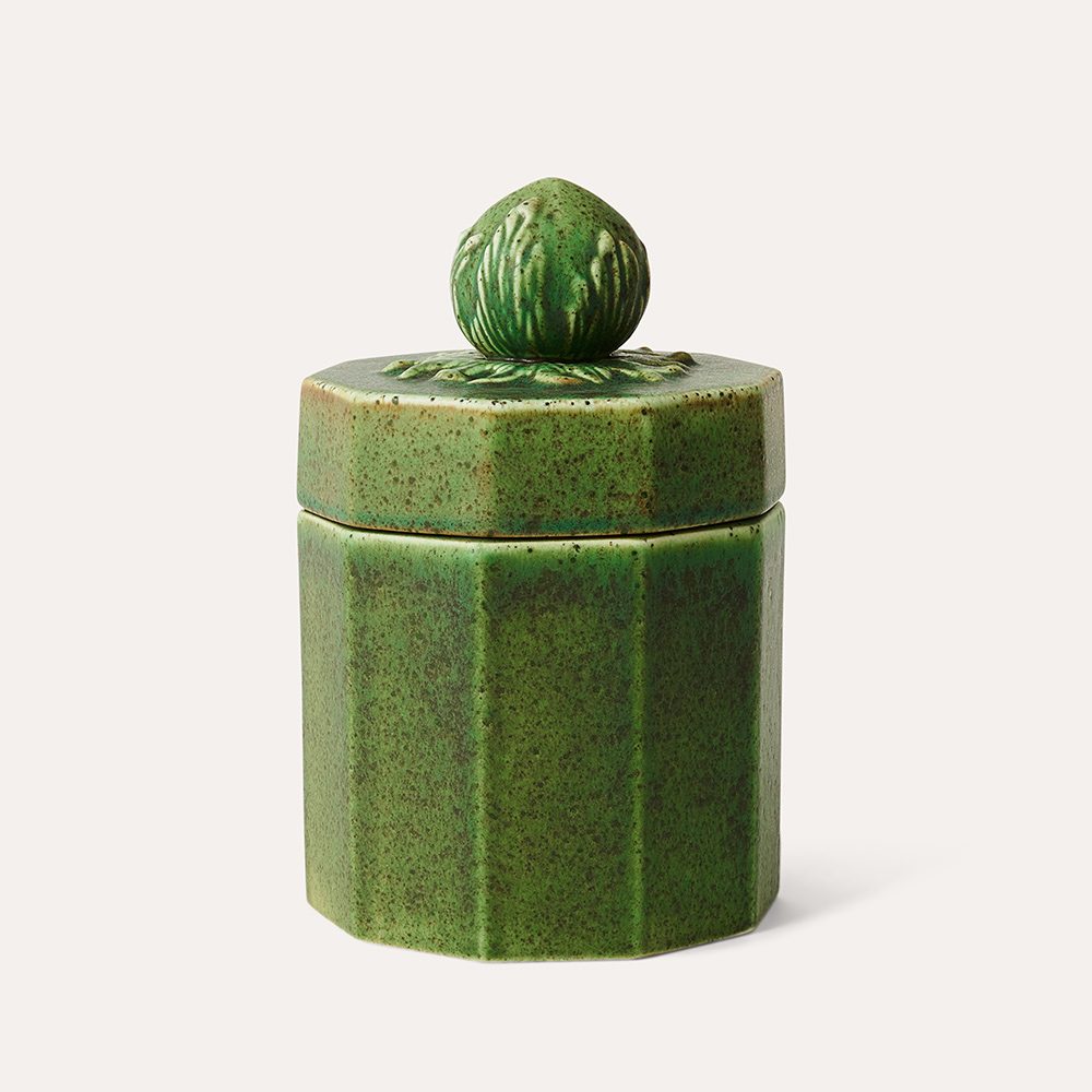 Krukken er laget av hvitt steingods med et skulpturert lokk glasert med en jordfarget glasur. Leire og glasur er levende materialer, og noen ganger med visse farger oppstår det helt naturlig sprekkdannelse i glasuren. Dette er kun i overflatelagene og ingenting som påvirker kvaliteten. Krukken er ikke beregnet for oppbevaring av mat.